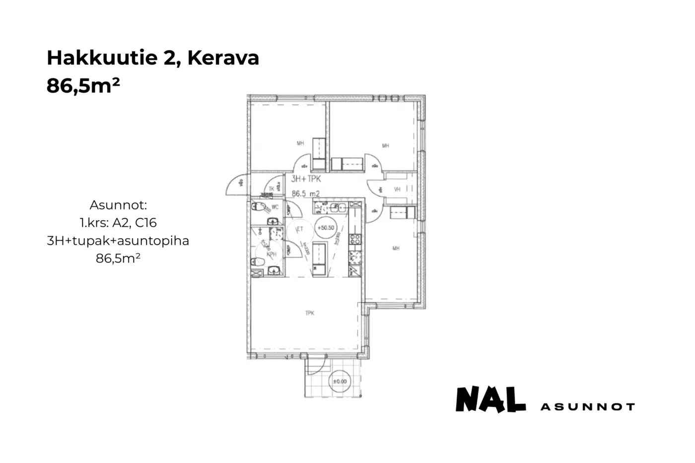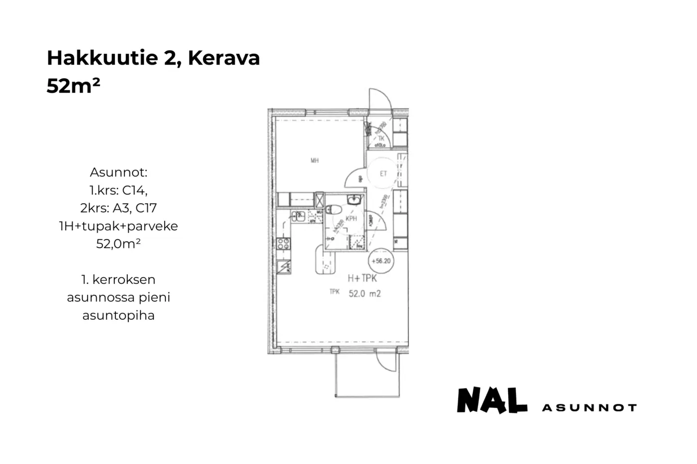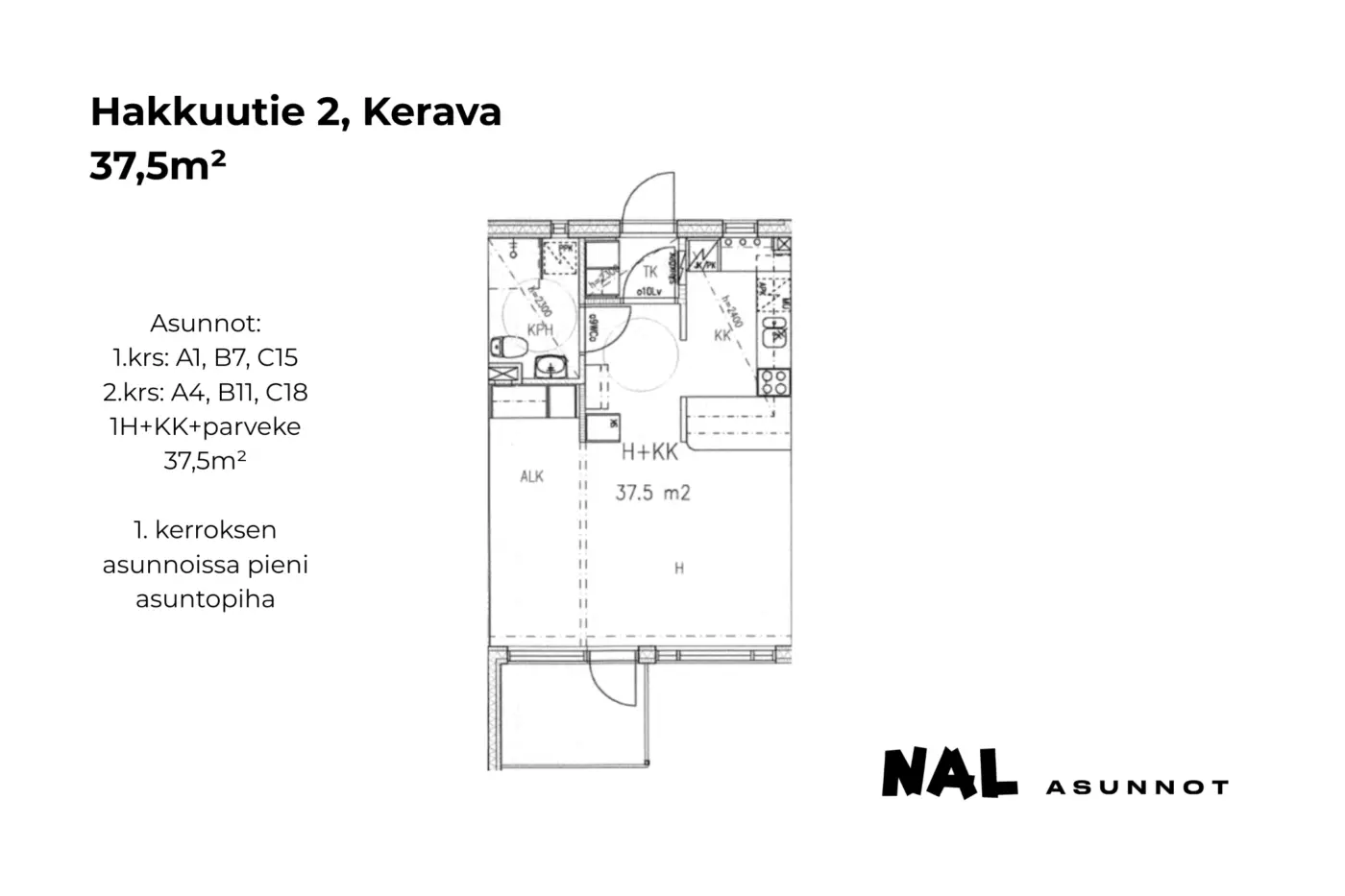 Huoneistotyypit: 1h, 2h, 3h